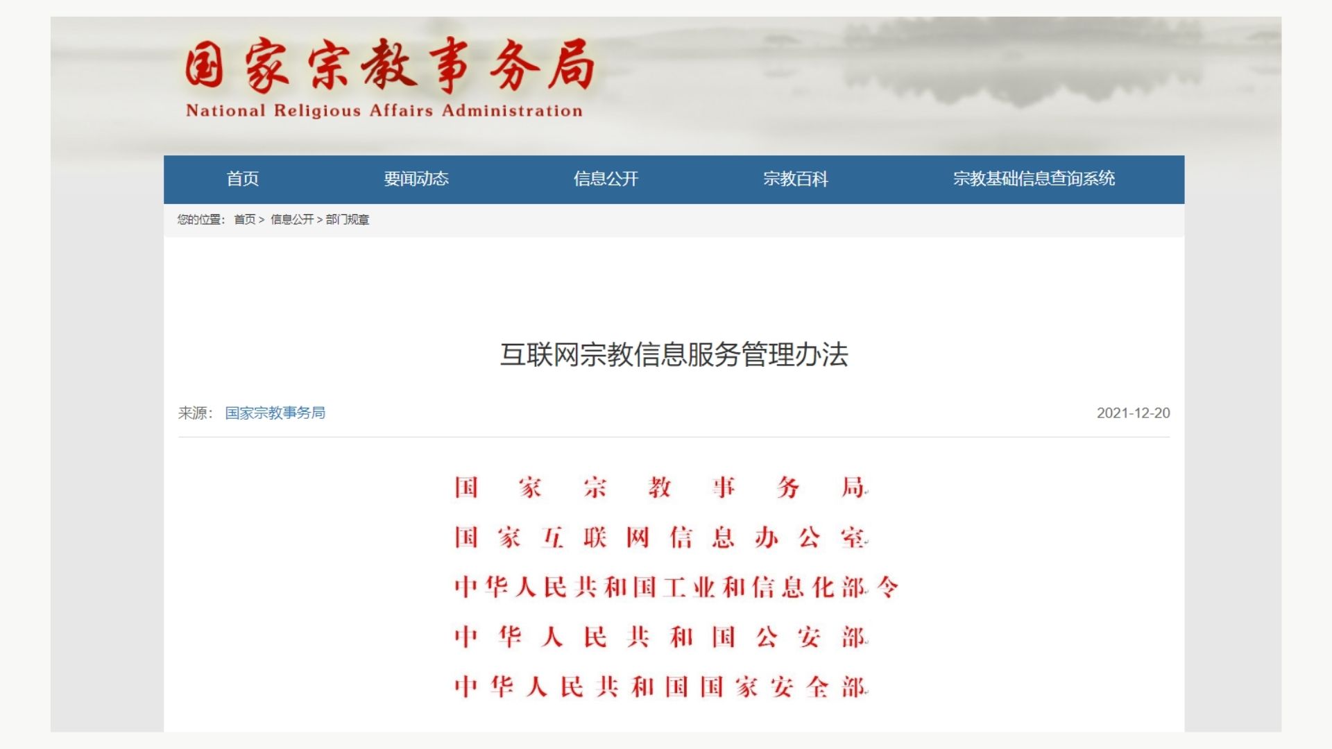 最新资讯 国家宗教事务局相关负责人就《互联网宗教信息服务管理办法》答记者问 为规范互联网宗教事务管理,落实《宗教事务条例》相关规定,国家宗教事务局、国家互联网信息办公室、工业和信息化部、公安部和国家安全部五部门近日公布了《互联网宗教信息服务管理办法》(以下简称《办法》)。日前,国家宗教事务局相关负责人就《办法》相关问题回答了记者提问。 today2022年02月13日 chat_bubble_outline0条评论
